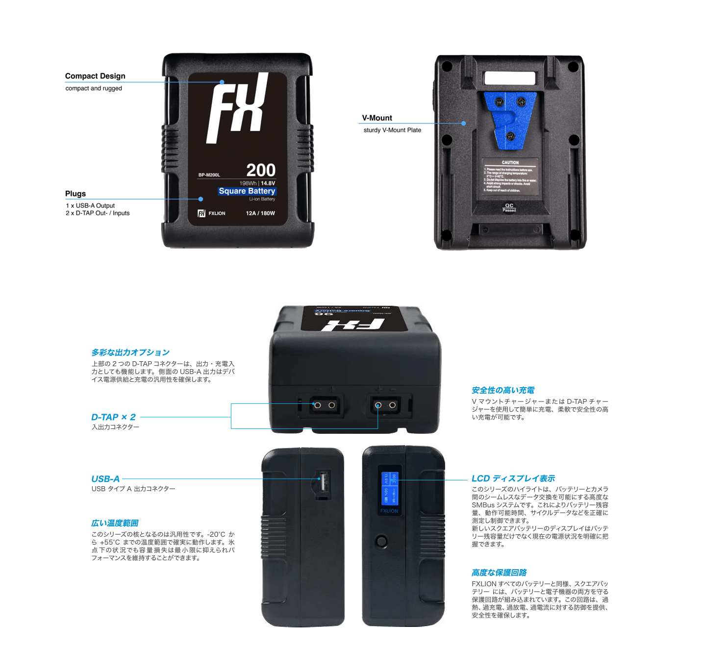 シリーズの最大容量はBP-M200の200W/h。安全性も考慮され、バッテリーおよびその使用電子機器を過熱、過充電、過放電、過電流から守る保護回路が組み込まれています。