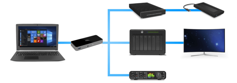 ※本製品を経由してパソコンへ接続されるすべての機器は1つのThunderboltポートの帯域を共有しているため、機器によってはパソコンのThunderboltポートへ直接接続した時よりもデータ転送速度が低下する場合があります。