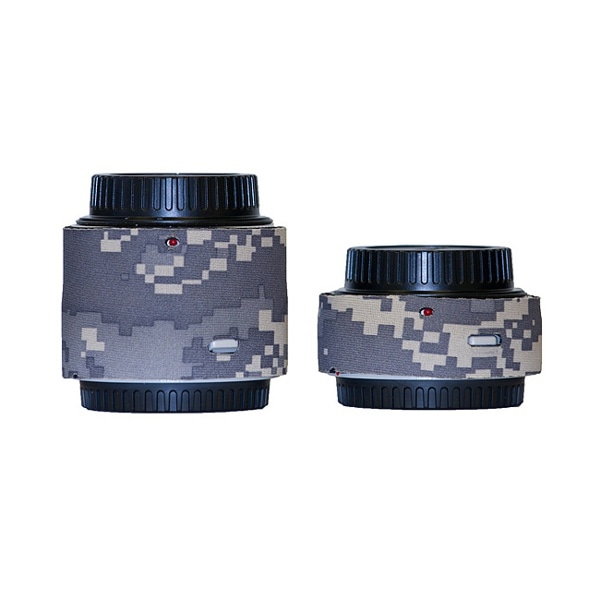 CanonEF1.4XIII & EF2xIIIエクステンダー用 アメリカ・ニュージャージー州でひとつひとつ手作りされる、望遠レンズの鏡筒をキズから守る保護カバーです。これは単なるカバーではなく、使用感を損なわない薄目約2mm厚のネオプレーン生地を使用し、裏には滑り止め加工が施されており、開きの大きな花形フードにも食い付きが良いのが特徴です。迷彩や冬季迷彩などの中からお好みと用途に合わせてお選び下さい。Canonのテレコンバーター用は1.4x用と2x用の2種セットになっています。 カラー:デジタルカモ・・・風景をデジタル処理で加工した柄で、近い色を持った景色にとけ込みやすく汎用性があります。
