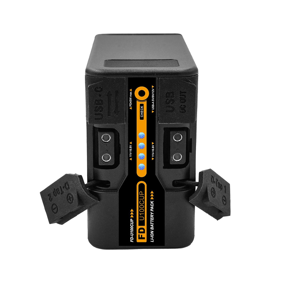 BP-U 互換の「FD-U100CUP」(写真右側 3 点)は USB-A および C が各 1、また 2 つの D-TAP ポートが装備されています。