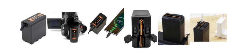 NP-F 互換の「FS-F970CUP」(写真左側 3 点)は USB-A および C ポートが各 1 装備しています。