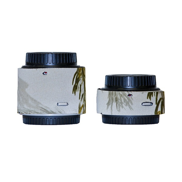 CanonEF1.4XIII & EF2xIIIエクステンダー用 アメリカ・ニュージャージー州でひとつひとつ手作りされる、望遠レンズの鏡筒をキズから守る保護カバーです。これは単なるカバーではなく、使用感を損なわない薄目約2mm厚のネオプレーン生地を使用し、裏には滑り止め加工が施されており、開きの大きな花形フードにも食い付きが良いのが特徴です。迷彩や冬季迷彩などの中からお好みと用途に合わせてお選び下さい。Canonのテレコンバーター用は1.4x用と2x用の2種セットになっています。 カラー:リアルツリー・スノー・・・冬季の林木立を再現した柄で、白く雪が掛かった状態がプリントされています。