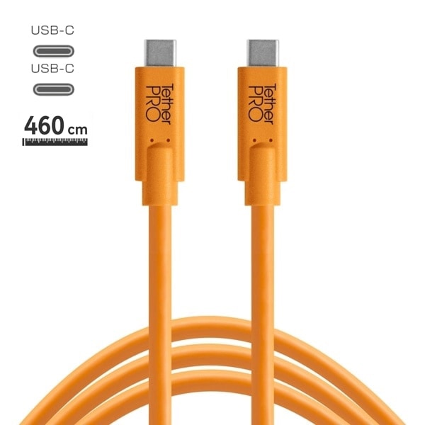 カメラをパソコンに接続するためのUSB-C対応ケーブルです。機材に合わせて、コネクタの形状をお選びいただけます。USB C コネクタ-USB C コネクタケーブルは4種類の長さ、ほかのケーブルは長さ460cm、全て2色展開です。オレンジ色のケーブルは薄暗い現場でも自己主張し、不慮の事故を防ぎます。※データ転送専用のケーブルです。機器の電源供給や充電などには使用しないでください。USB-C to USB-Cケーブルです。460cm。
