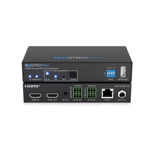 HD11CTRL-V2は、前モデルHD11CTRLの性能を大幅に向上させた次世代型HDMIインラインコントローラです。本製品は、HDMI入力信号(5V/TMDS)やセンサー信号の検知をトリガーとして、多様な制御信号を送出可能な高機能デバイスです。CEC、RS-232、IR信号、そしてTCP/IP経由でのディスプレイやプロジェクターの制御に加え、リレー制御による電動プロジェクタースクリーン、照明、ブラインドなどの操作も可能です。TCP/IPとの連携機能が新たに追加され、ウェブGUIを通じた直感的な操作が実現しました。本体には、4K@60Hz 4:4:4(18Gbps)対応のHDMI入出力端子、外部センサーやボタン接続用の端子、各種制御信号用の端子(IR、RS-232、TCP/IP)、そしてリレー制御用端子を搭載しています。これらの豊富な接続端子により、複雑なAVシステムの統合的な制御が可能となります。