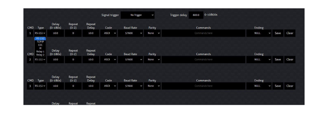 HDMI信号の検知状態、外部センサーからの入力、またはその組み合わせをトリガーとし、HDMI CEC信号、IR信号、RS-232信号の送信、リレーの開閉、TCP/IP経由のコマンド送信等最大10個のコマンドを1つのマクロに設定でき、最大10パターンのマクロをウェブGUIにて設定可能です。
