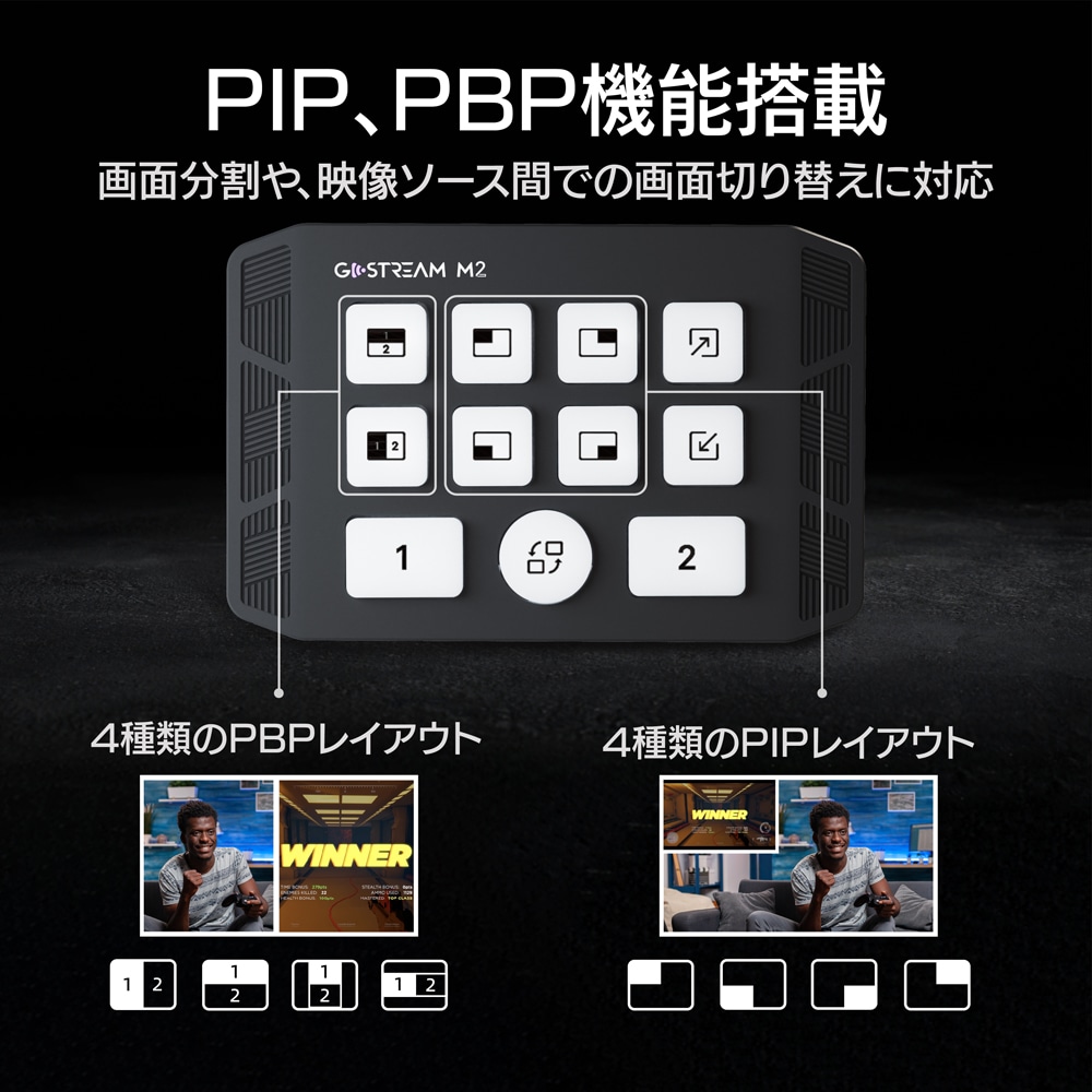 | ビデオエフェクト | PBP(4レイアウト)、PIP(4レイアウト・ズームイン/アウト)、ビデオソーストランジション |