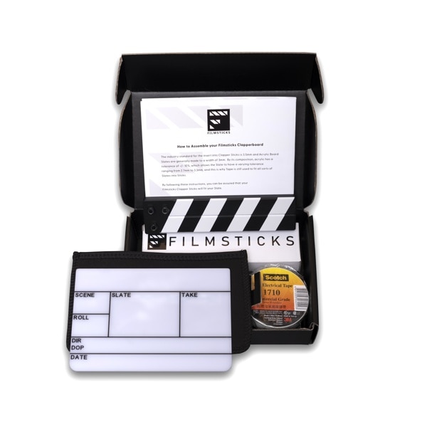 クラッパースティック、アクリルボード、クラッパーボード用カバー、テープのセットです。