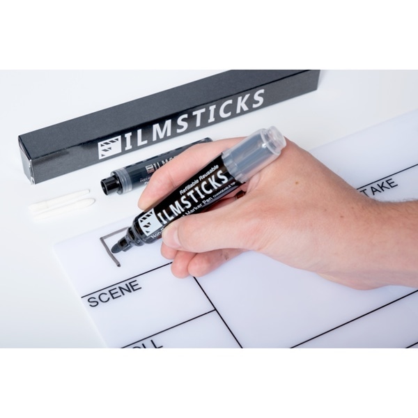 クラッパースティック、アクリルボード、クラッパーボード用カバー、テープのセットです。