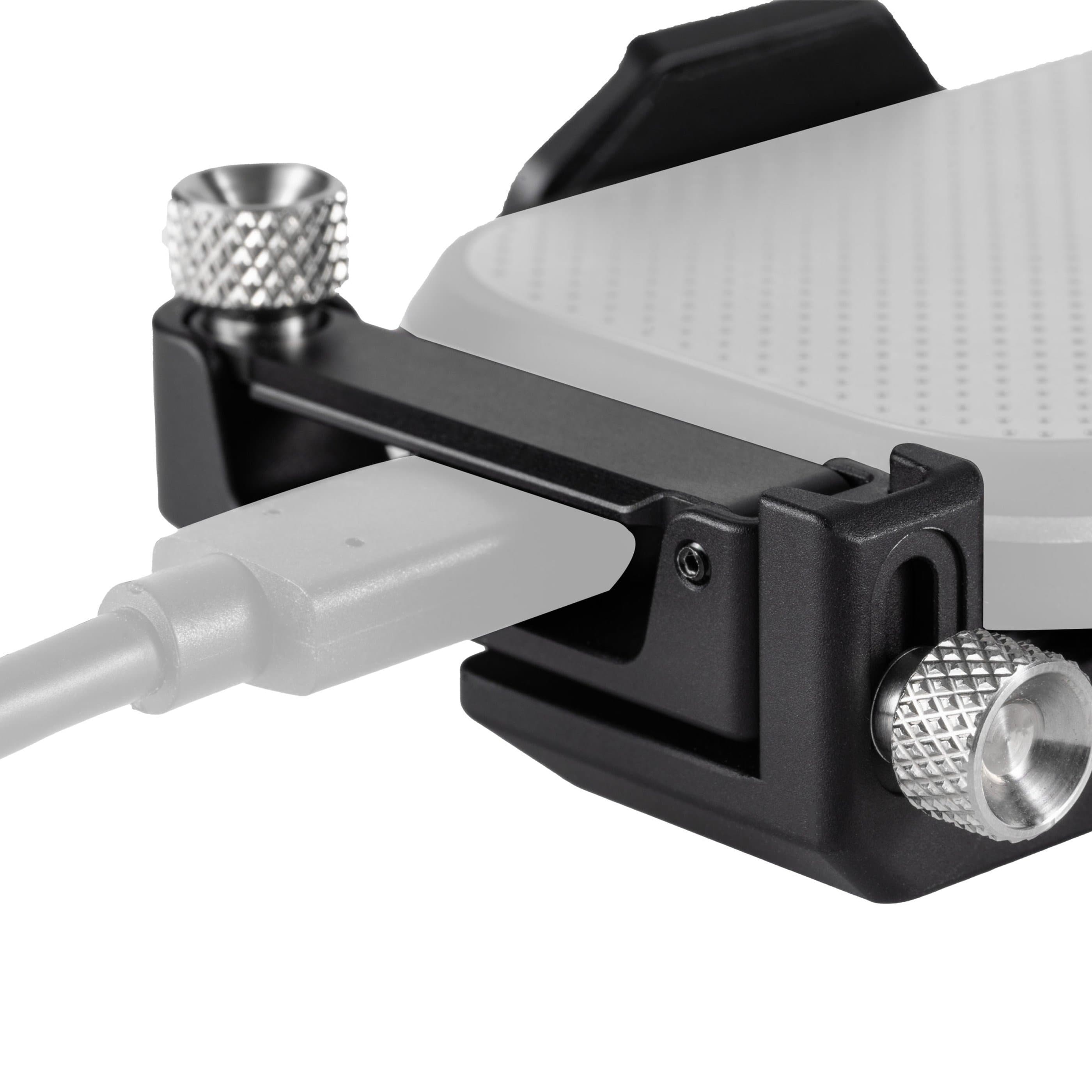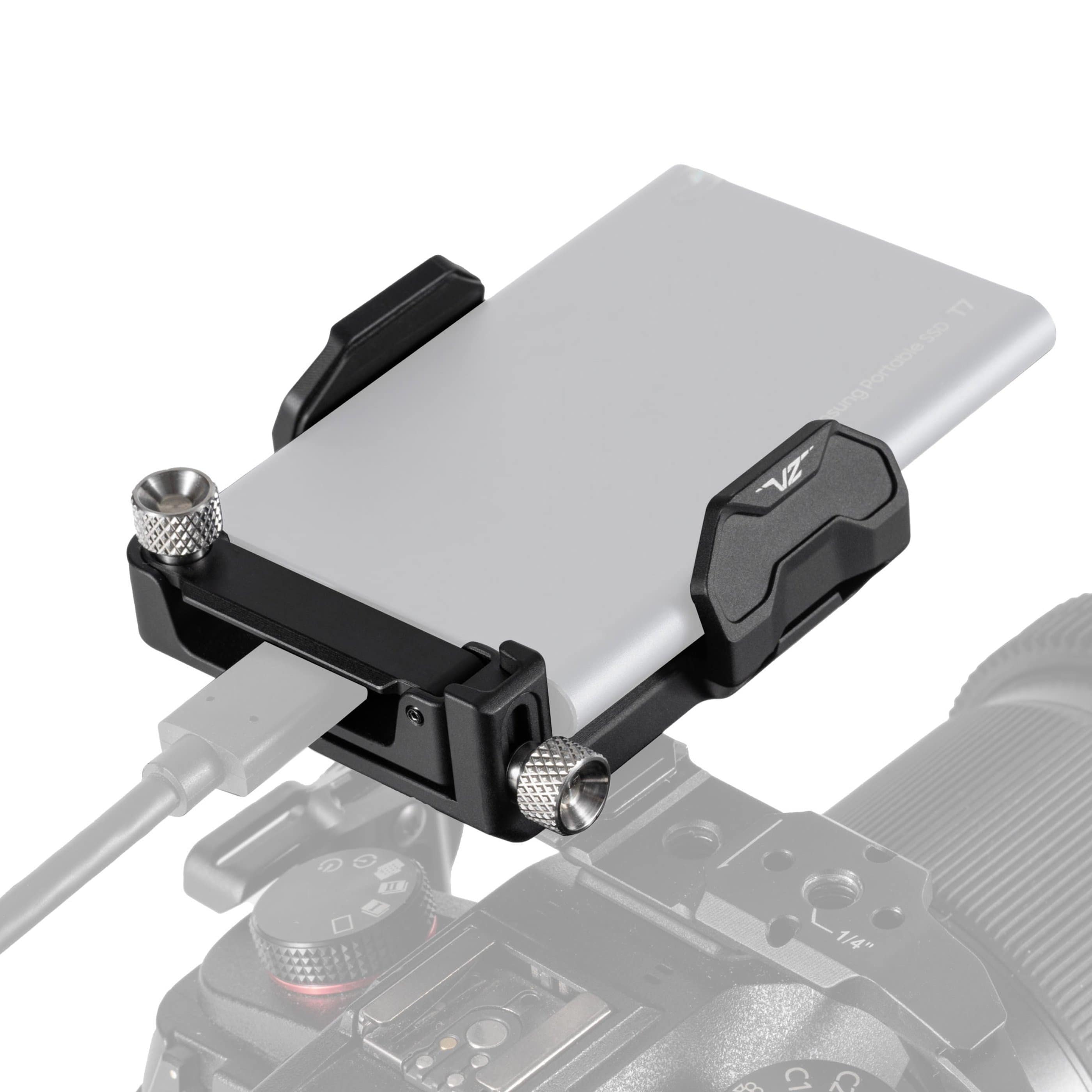 ユニバーサルSSDドライブホルダー ver.2は、様々なSSDをカメラケージに取り付け、外部収録を可能にします。デュアル1/4″-20ネジは十分なセキュリティを提供し、ホルダーが不用意に回転することを防ぎます。