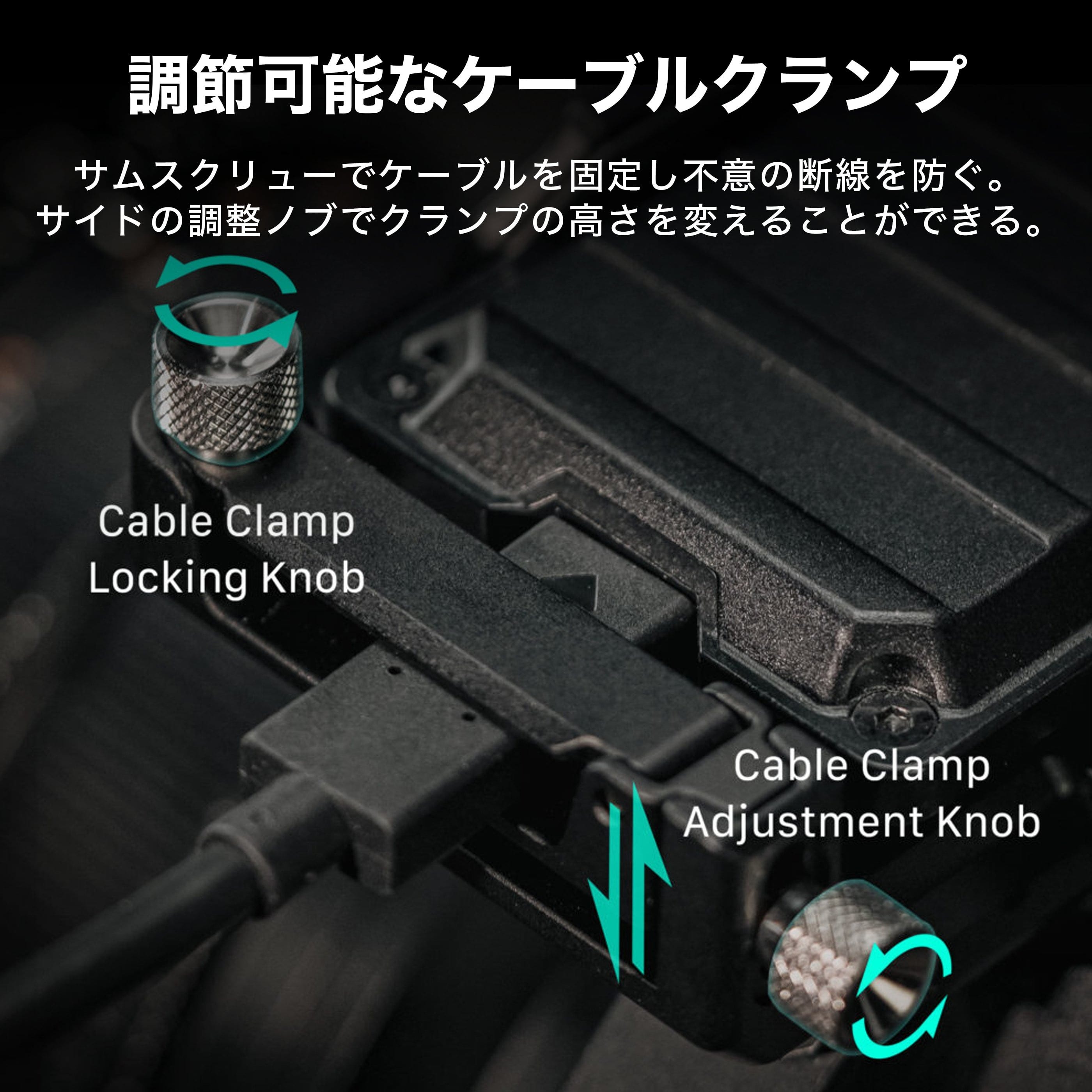 ケーブルクランプと高さ調整ノブは手締め可能でさまざまなケーブルに対応しSSDとケーブルの予期せぬ切断を防ぎます。
