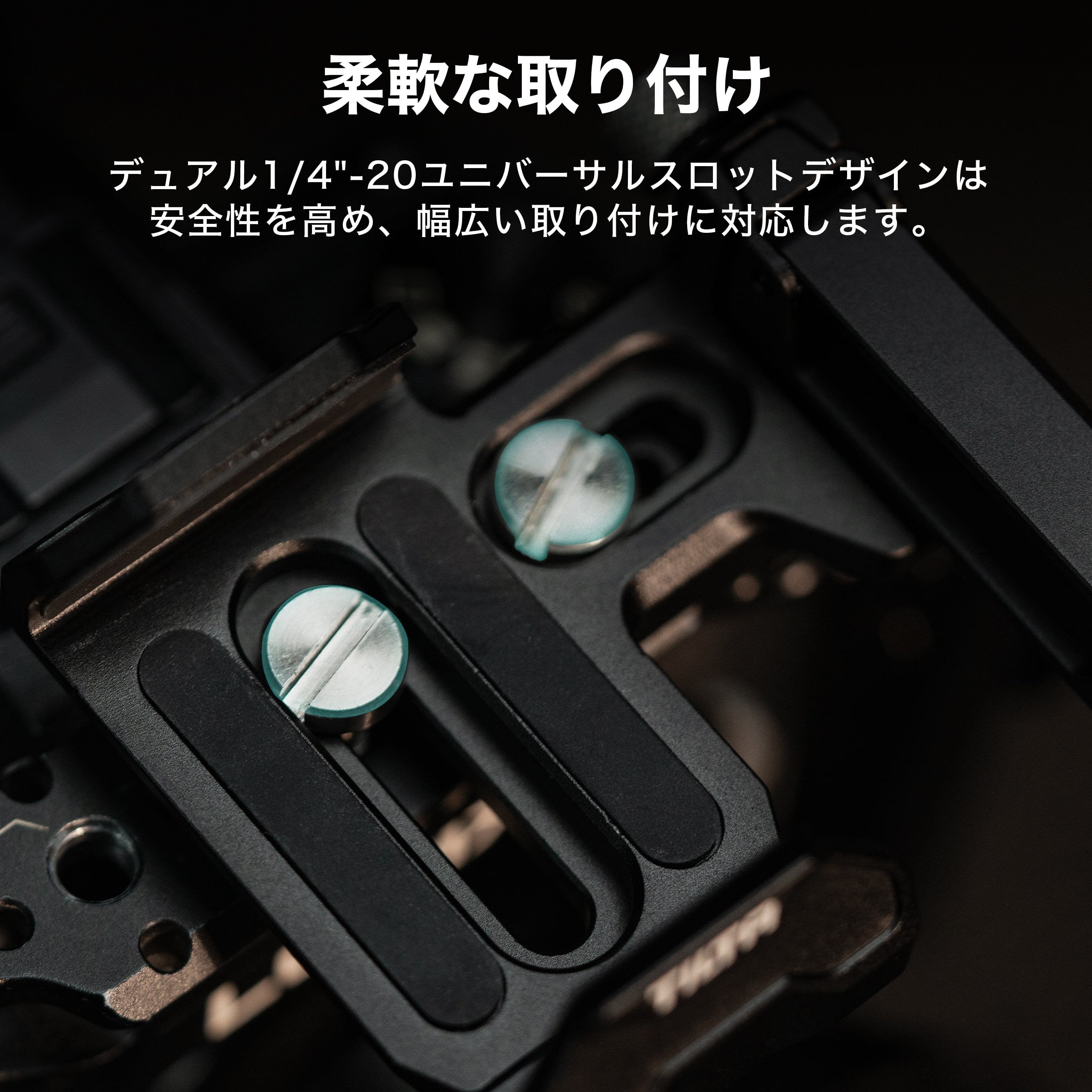 このSSDホルダーの中央部にはスクリュースロットが内蔵されており、カメラケージにアクセサリーを取り付ける場所の柔軟性が向上します。