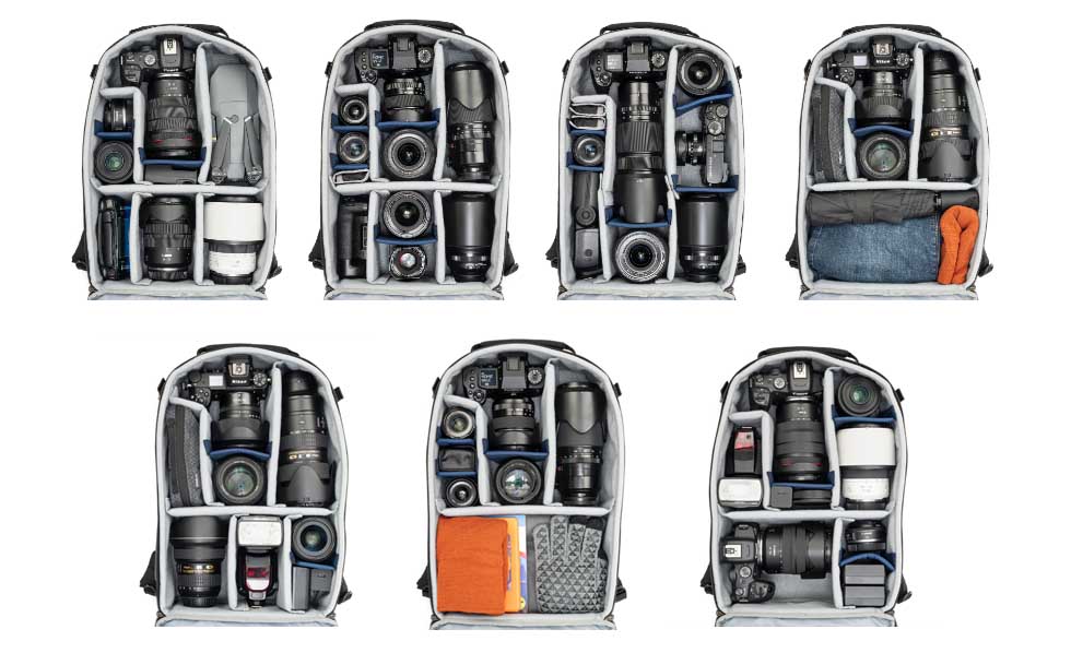 ミラーレスカメラ1台、4-6本のレンズ、アクセサリー、または70-200mm F2.8 を装着したフード付きミラーレスカメラ1台、レンズ数本、アクセサリーなどを収納可能です。