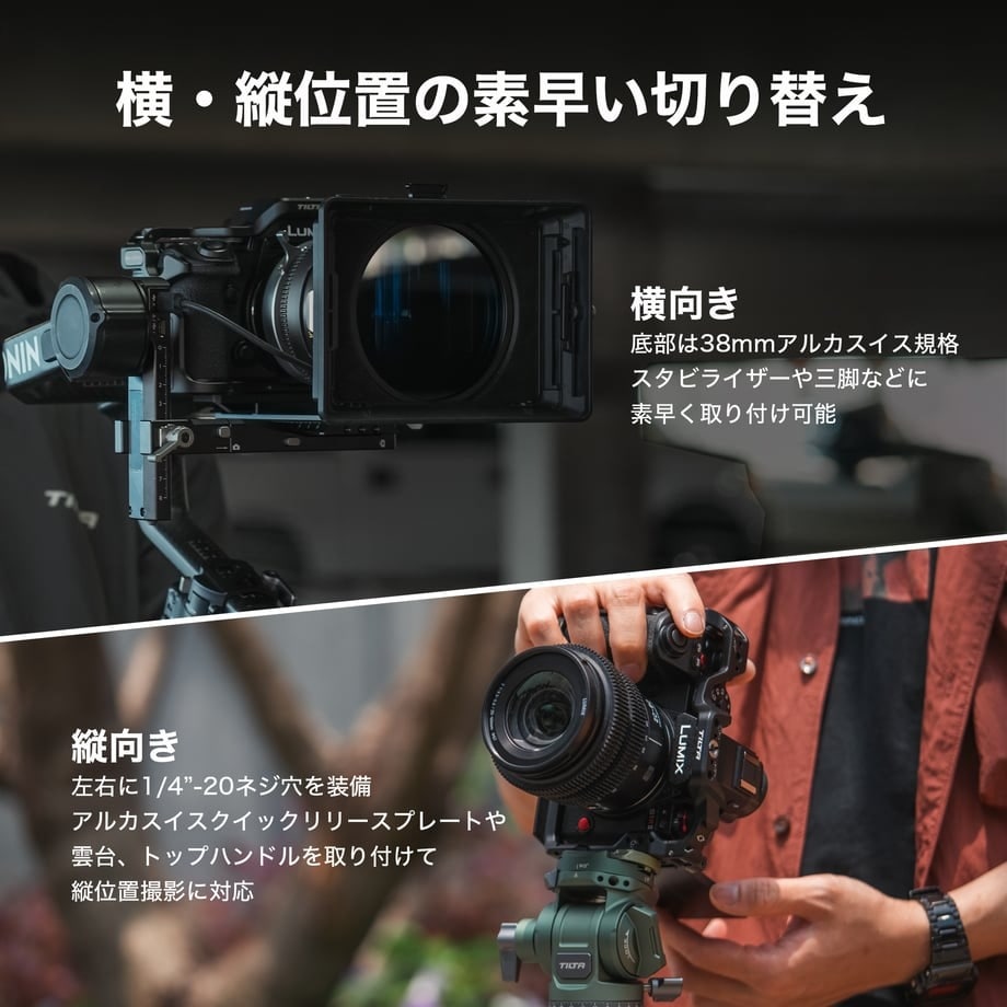 このフルカメラケージは、Panasonic S1R II / S5 II / S5 IIX / G9 II向けに設計されており、カメラボディを保護しながら、さまざまなアクセサリーの取り付けを可能にします。ケージ本体には、リストストラップ用マウント、位置決めポイント付きの1/4″-20ネジ、3/8″-16から1/4″-20への変換アダプターが搭載されています。底部のアルカボトムプレートは、三脚やサポートシステム、DJI Ronin RS4 Proジンバルなどへの簡単な装着が可能です。