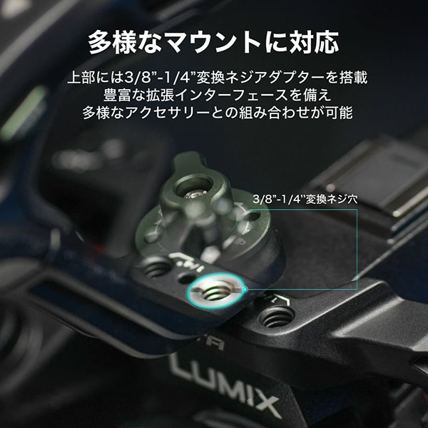 ハンドルには、1/4"-20 、3/8"-20位置決め穴、コールドシューマウントがありモニターやライト、マイクなどのアクセサリーを取り付けることができます。