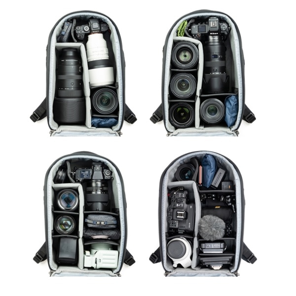 多くのカメラ機材を収納できるメインコンパートメントに、バッグ内側のノートPC用スリーブ、オーガナイザー付きで小物の収納に便利なフロントポケット、さらに水筒などを収納できるジッパー付きサイドポケットなど、荷物の多いプロフェッショナルフォトグラファーに最適な設計です。