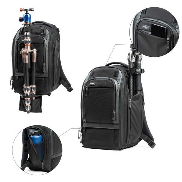 なお、大型三脚はバッグ下方の三脚ポケットを使用して、バッグ前面に取り付けて持ち運びができます。多くの撮影機材やアクセサリーを、整理して収納できるバックパックです。