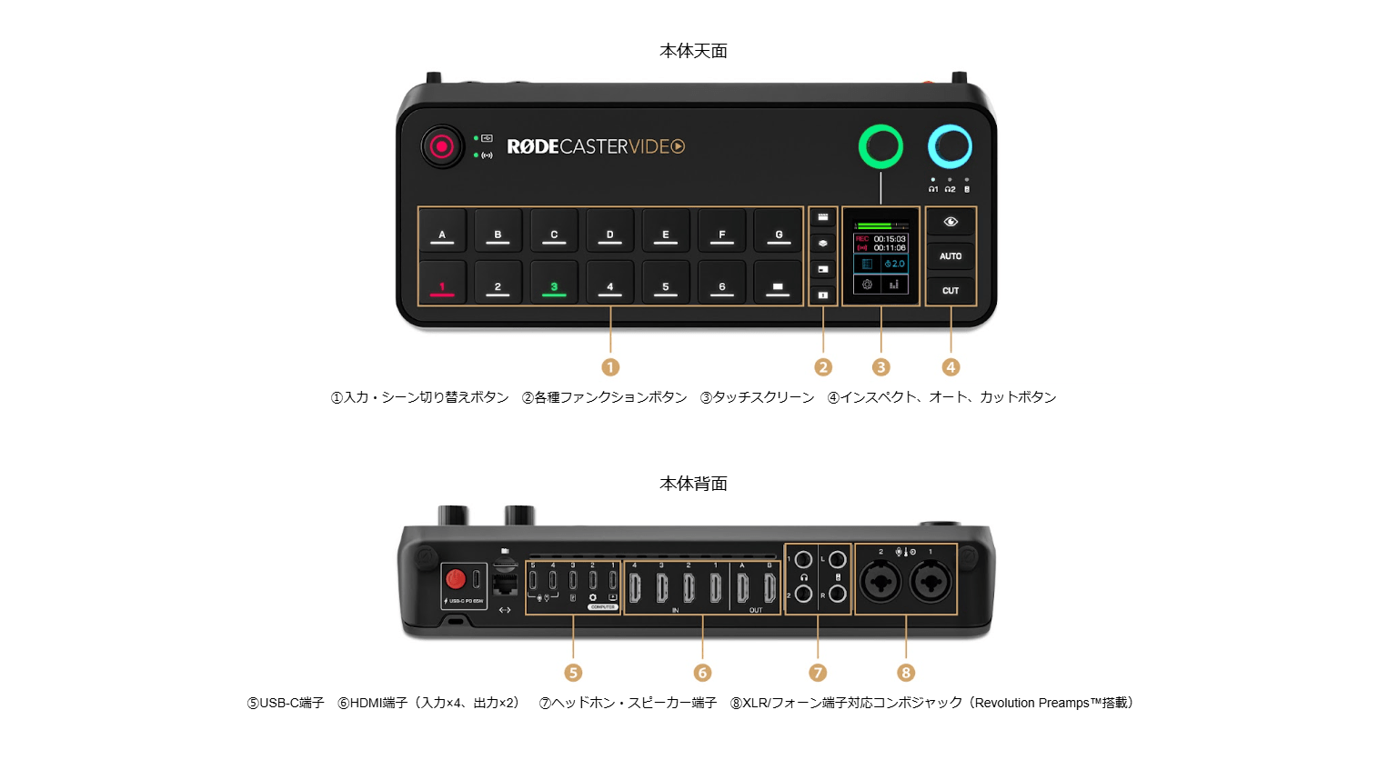 | デジタルオーディオ入出力 | USB1 2入力2出力 USB1 Chat 2入力2出力(ミックスマイナス対応) USB2 2入力2出力(MFi対応) USB4 / 5 RØDE製USBマイク、ロードキャスタープロII、ロードキャスターデュオに対応 | ||