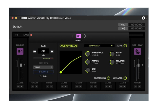 さらに、RØDE独自開発の超低ノイズ・ハイゲインプリアンプ「Revolution Preamps™」を搭載。また「APHEX®オーディオプロセッサ」により、Aural Exciter™やBig Bottom™、Master Compellor™をはじめ、コンプレッサー、ノイズゲート、ハイパスフィルター、ディエッサー、イコライザーの調整が可能です。
