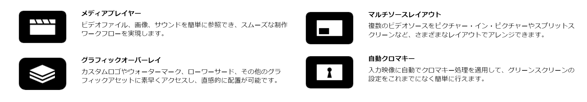 | スイッチャー仕様 | 表示レイヤー数 | 9(プレビュー、プログラム) | |