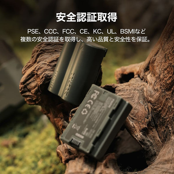 純正バッテリーと同じ寸法で設計されており、カメラに完璧にフィット。 さらに、PSE、CCC、FCC、CE、KC、UL、BSMIなどの国際安全認証を取得し、安心して使用できます。