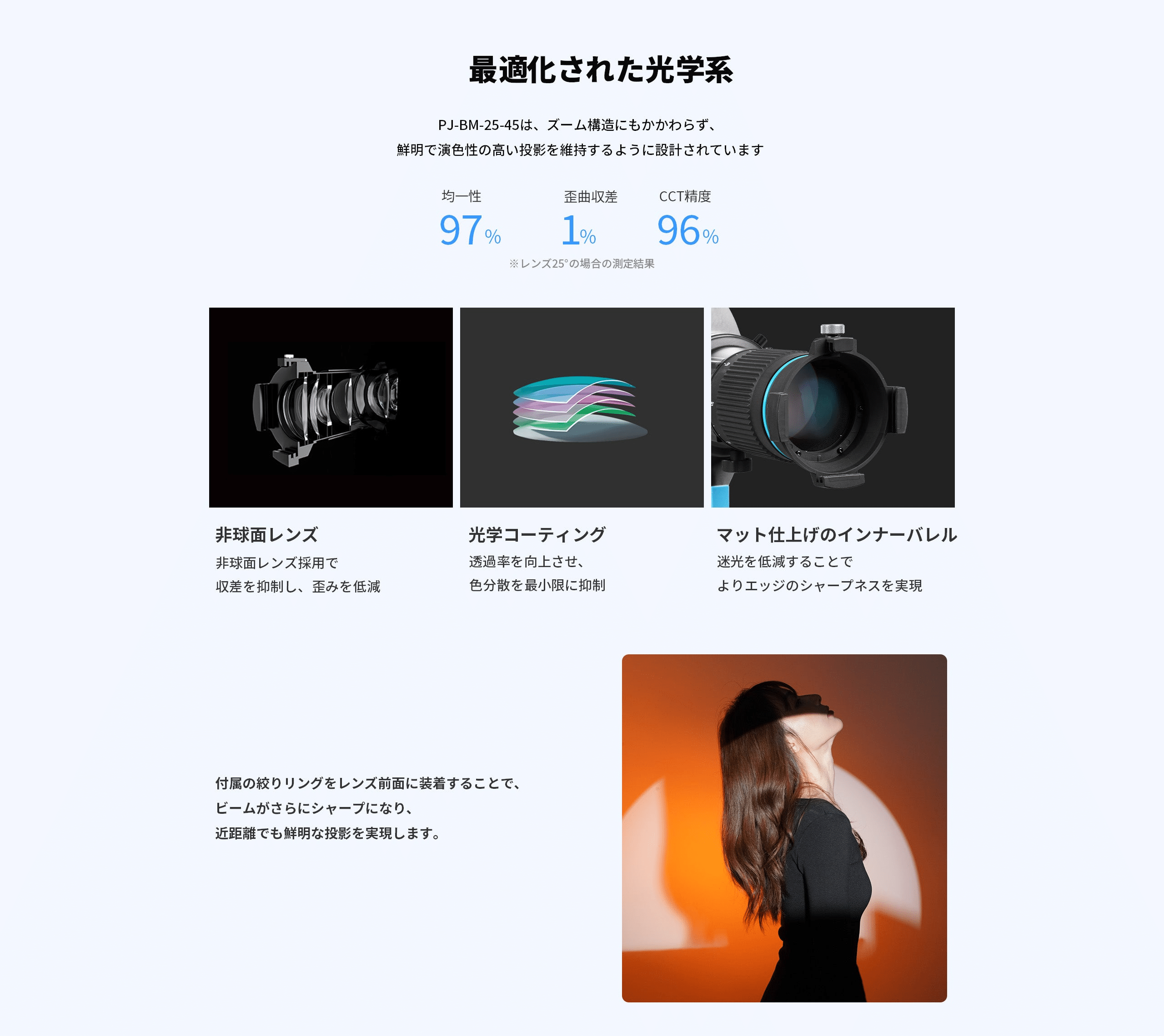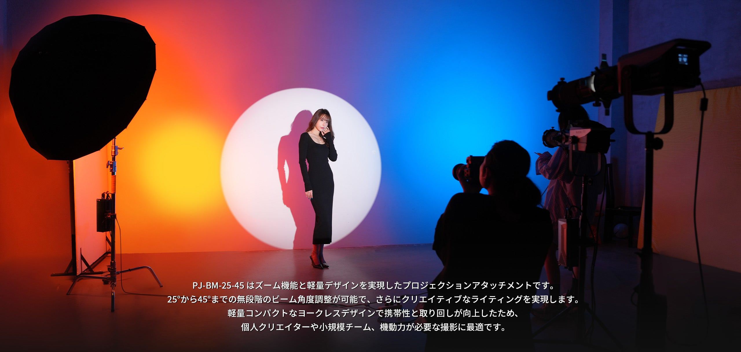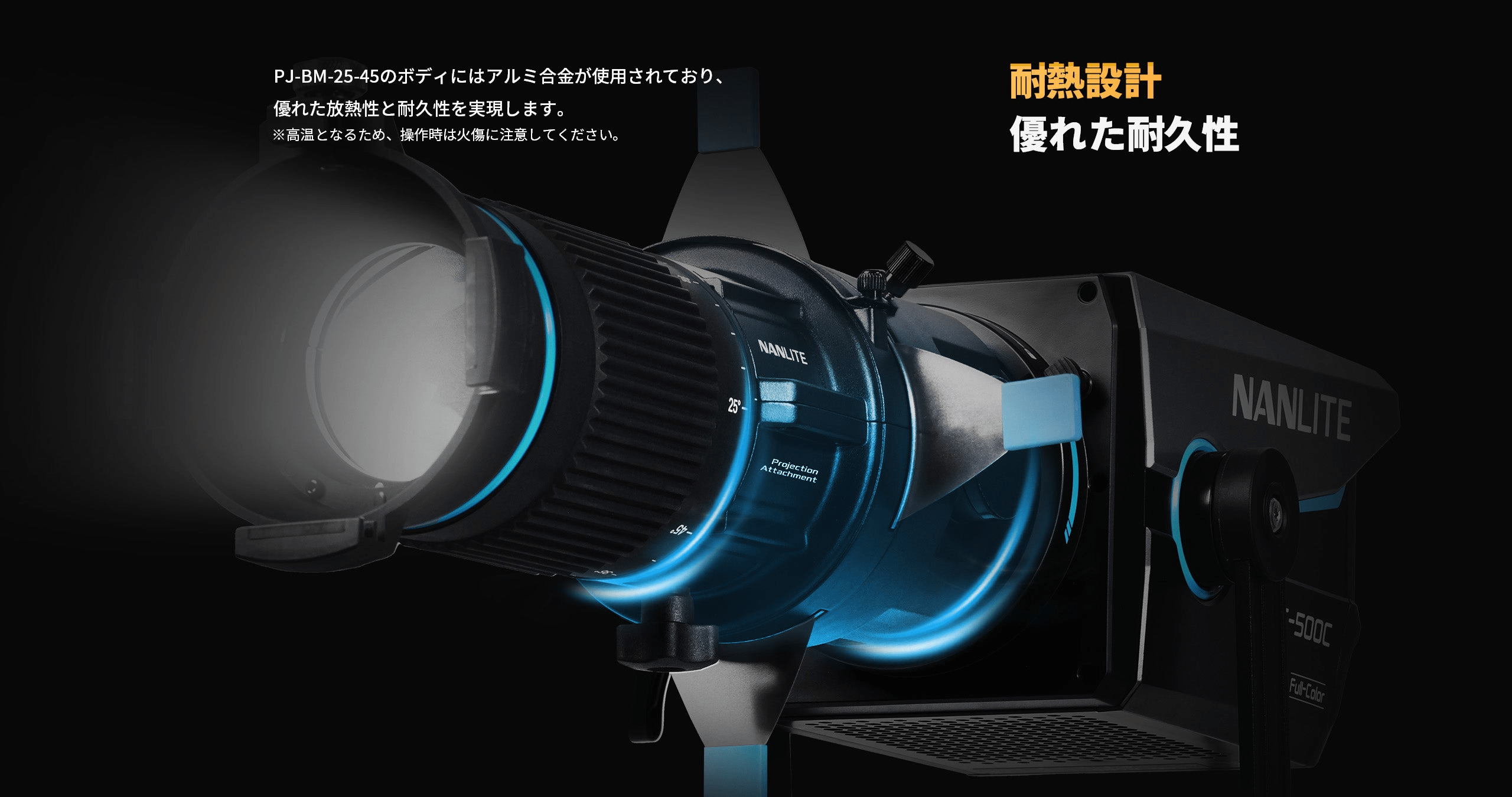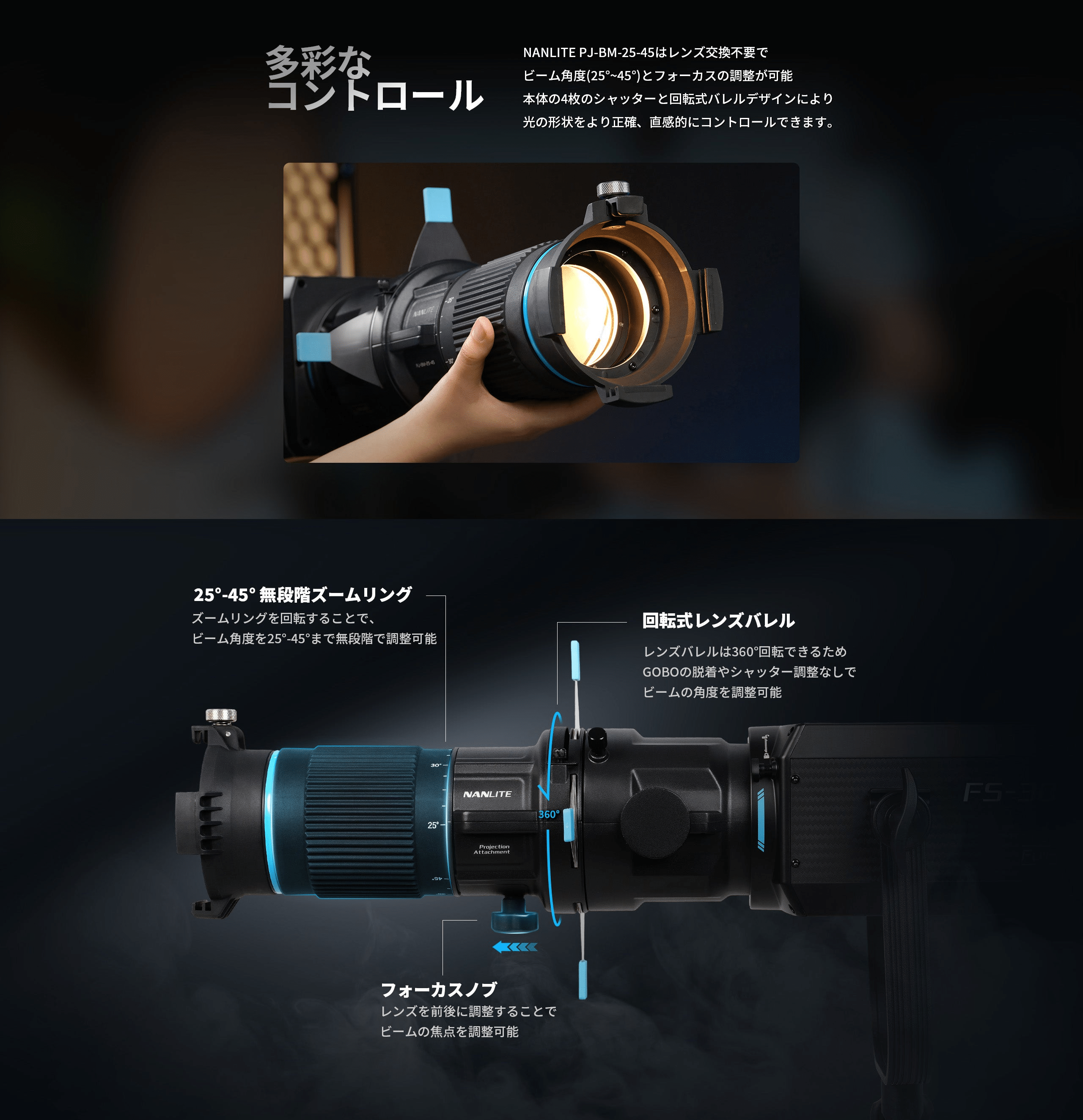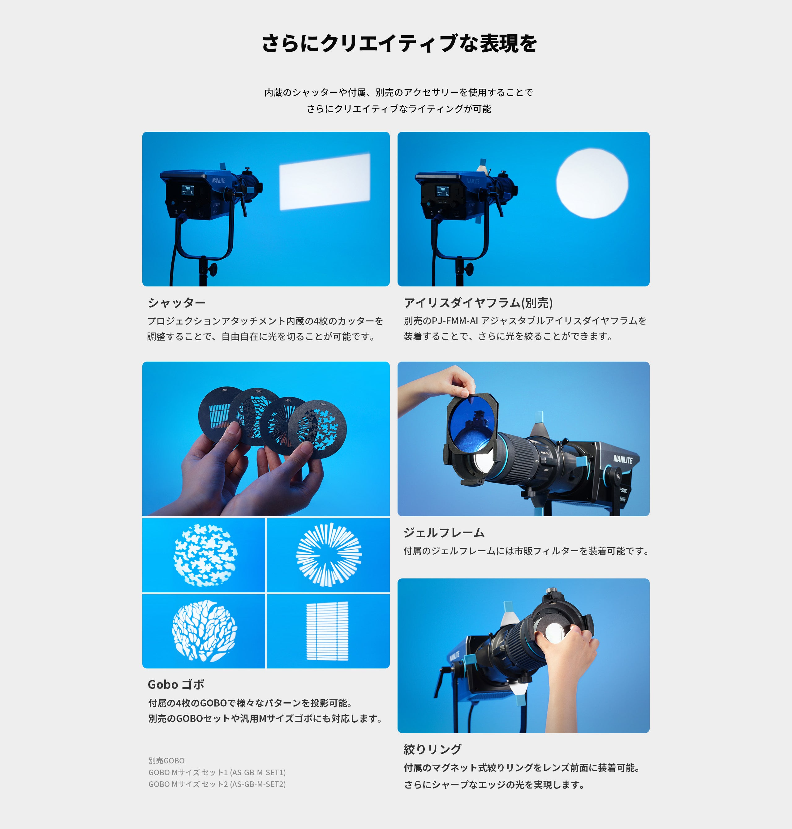 | 同梱品 | ・FMマウント プロジェクションアタッチメント 18°-36° × 1 ・プラスチック製保護カバー(前面)× 1 ・プラスチック製保護カバー(背面)× 1 ・ゴボ × 4 ・ゴボホルダー × 1 ・Mサイズ ゴボホルダー × 1 ・ジェルフレーム × 1 ・取扱説明書 × 1 ・キャリーバッグ × 1 | ・ボーエンズマウント プロジェクションアタッチメント 25°-45° × 1 ・プラスチック製保護カバー(前面)× 1 ・プラスチック製保護カバー(背面)× 1 ・ゴボ × 4 ・ゴボホルダー × 1 ・ジェルフレーム × 1 ・絞りブレード × 1 ・取扱説明書 × 1 ・キャリーバッグ × 1 |