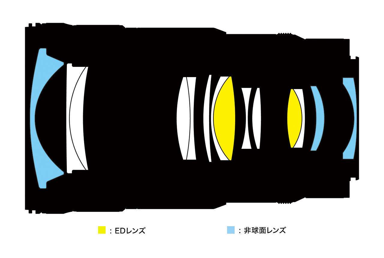 | レンズ構成 | 10 群14 枚(EDレンズ2 枚、非球面レンズ3 枚、メソアモルファスコートあり、アルネオコートあり 、最前面のレンズ面にフッ素コートあり) |