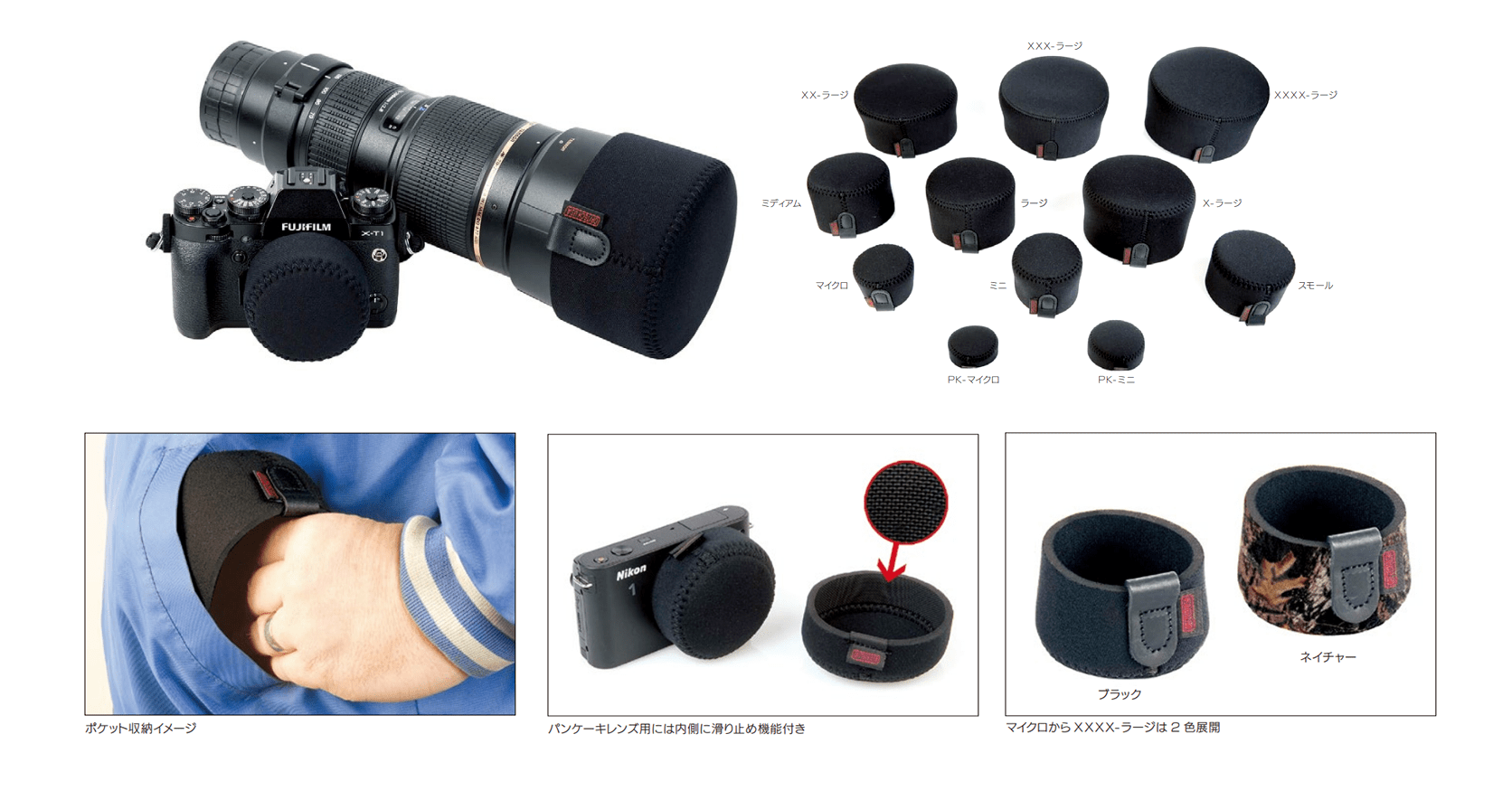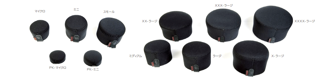 さまざまなレンズに対応できるように、マイクロからXXXX-ラージまでの9サイズ展開、色はブラックとネイチャーの2色をご用意しています。