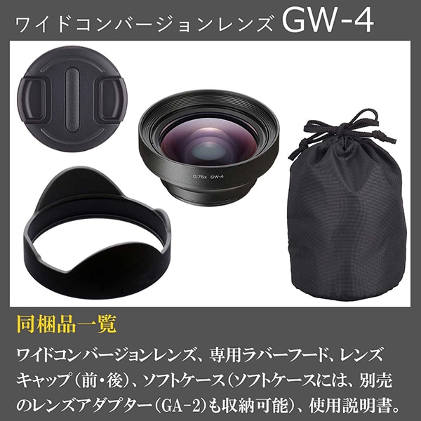 ワイドコンバージョンレンズ、専用ラバーフード、レンズキャップ(前・後)、ソフトケース(ソフトケースには、別売のレンズアダプター(GA-1)も収納可能)、使用説明書