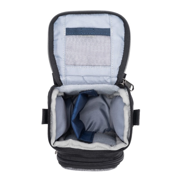 小型ミラーレスカメラにパンケーキレンズまたは小型望遠レンズを装着したまま収納できます。フロントポケットにはキーフック、ポケット 1 つ、メモリーカード用ポケット 2 つがあります。