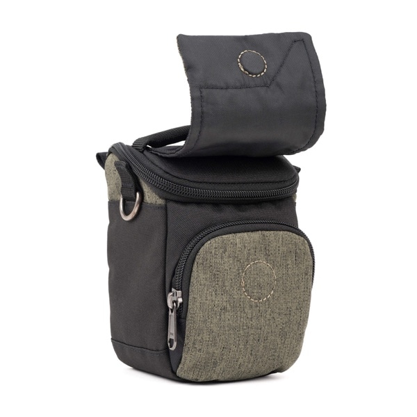 小型ミラーレスカメラ(マイクロフォーサーズ)に、パンケーキレンズまたは小型望遠レンズを装着したまま収納できます。フロントポケット付き。