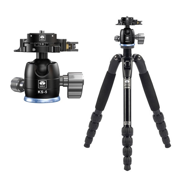 SiruiのT-005SK T-0S シリーズ旅行用三脚と KS-5 ボール ヘッド は、5 セクションのサポート システムで、伸縮可能なアルミ脚と 2 段階のセンター コラムを備え、最大高さ 54.2 インチに達します。3 段階の脚角度、独立した脚の広がり、取り外し可能なセンター コラムにより、脚は最小高さ 6.2 インチまで完全に広げることができます。2.4 ポンドの三脚を保管または持ち運ぶときは、脚を 180 度折りたたんでコンパクトな 15.1 インチにします。