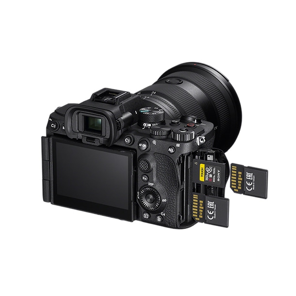 α7 Vでは、望遠レンズを装着する場合や、長時間の撮影時でも疲れにくいよう、ホールド性と操作性をさらに向上。グリップは手のひらに自然にフィットし、シャッターボタンの位置や角度も、スムーズに操作できるよう最適化されています。また、ソニー独自の4軸マルチアングル液晶モニターを搭載。横開きバリアングル液晶モニターとチルト液晶モニターの利便性を兼ね備え、横位置でも縦位置でも見やすい位置に自在に角度を調整できます。さらに、USB PD(Power Delivery)(*1)に対応したUSB Type-C(R)端子を2基搭載したことで、より拡張性が向上しました。カードスロット1(上段)は、CFexpress Type Aメモリーカード(*2)に加え、SDXC/SDHC UHS-II/UHS-Iメモリーカードにも対応。大容量の画像データを高速に記録できます。