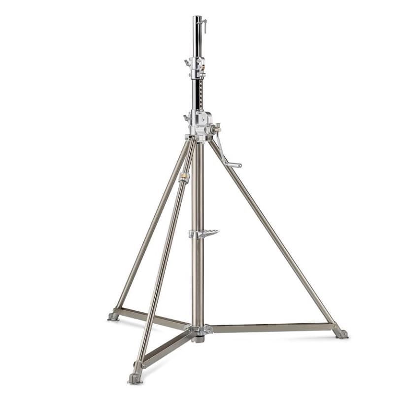 スチール製のクロームスタンドに巻き上げハンドルを備えた3段2ライザースタンドです。 ハンドル1回転ごとに4.4cmポールを巻き上げます。 内部にケーブルを備え、不意の落下を防止します。