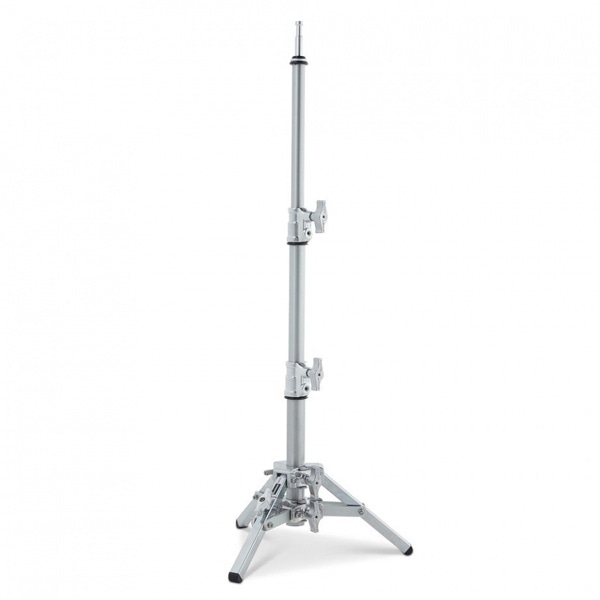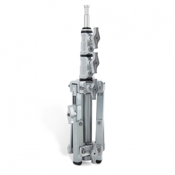 3段2ライザー構成で、最大15kgの機材を保持することができ、1mの高さまで伸ばすことが可能です。不整地でも使用できるよう、水平調整脚を1本備えています。また、5/8インチ(16mm)のトップアタッチメントを備えています。