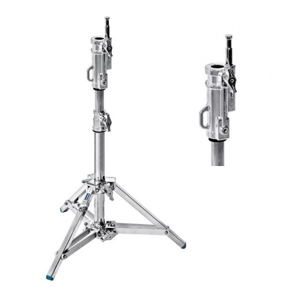 アベンジャーコンボスタンド10は、2段1ライザー構成のクロームスチール製スタンドです。最大30kgの機材を保持することができ、1mの高さまで伸ばすことが可能なヘビーデューティースタンドです。5/8インチ(16mm)オス型スタッドトップアタッチメントと1-1/8インチ(28mm)メス型レシーバーを備えています。また、不整地でも安定して保持できるよう、水平調整脚を1本備えています。