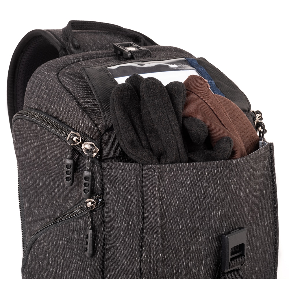 両側面のジッパーポケットにバッテリーや SD カードなどのアクセサリーを入れたり、前面のポケットに帽子やグローブなどの小物を収納できたりと、小ぶりながら収納力も備えています。