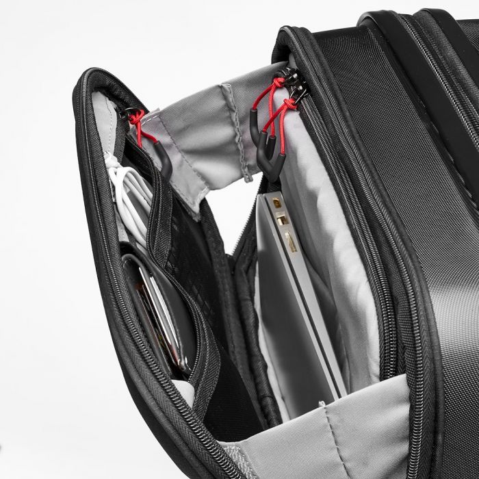 ・15インチまでのノートPCは機材収納スペースを開けずに取り出し可能。PC収納スペース内側のファスナーを開ければ、メイン収納部の機材へアクセス可能。