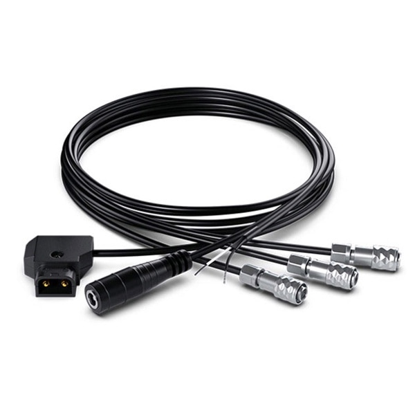 様々な電源ソースからPocket Cinema Cameraに給電可能。Dタップー2ピン、2.5mmバレルー2ピン、2ピンーフライリードを同梱しており、独自のカスタムケーブルを作成可能。すべてのケーブルの長さは650mm。