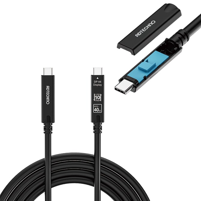 ケーブル部には、光ファイバと銅線のハイブリット構造ケーブルを採用。USB 3.2 Gen2による10Gbps高速データ通信およびDP Alt Modeによる映像伝送には光ファイバを使用し、USB 2.0/1.1通信や電力伝送には銅線を使用することで、各機能を最適に分担。これにより、最大15mもの長距離伝送とUSB-Cの各種機能をフルに活かした安定接続を両立しました。