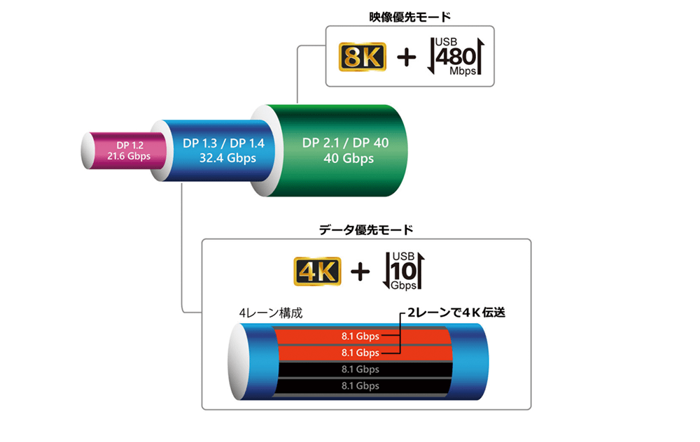 映像伝送とデータ伝送を同時に実現し、接続されるホストおよびデバイスに応じて、「映像:DP2.1(8K) + データ:USB 2.0」または「映像:DP1.4(4K) + データ:USB 3.2」の伝送モードを自動的に切り替えます。これにより、使用環境に合わせて常に最適な互換性と通信速度を確保できます。(※DP1.4規格では4レーンで最大32.4Gの8K伝送が可能ですが、本製品ではそのうちの2レーンだけを使用して16.2Gの4K伝送に対応しています。)