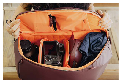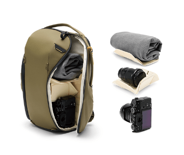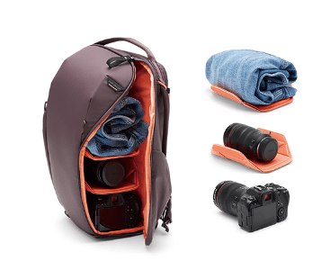メインコンパートメントは前面のジッパーで大きく開き、自由度の高い中仕切りでカメラやドローンなどの機材や小物を整理して収納できます。