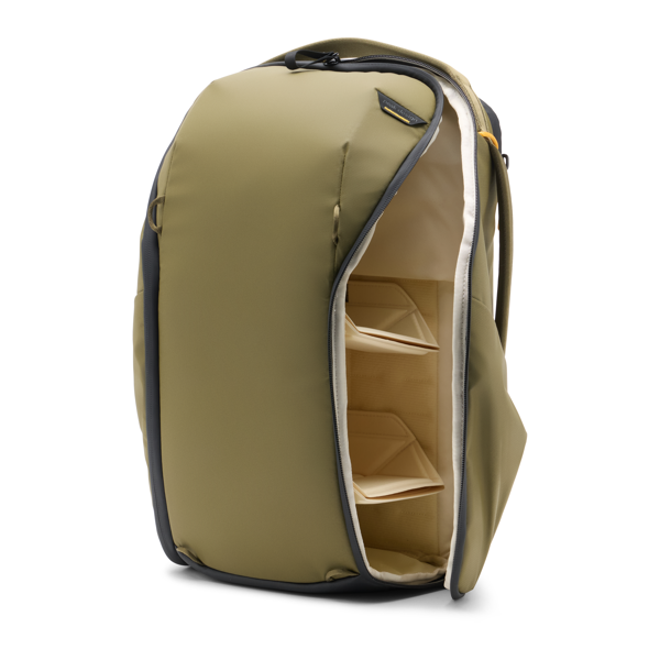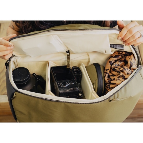 メインコンパートメントは前面のジッパーで大きく開き、自由度の高い中仕切りでカメラやドローンなどの機材や小物を整理して収納できます。
