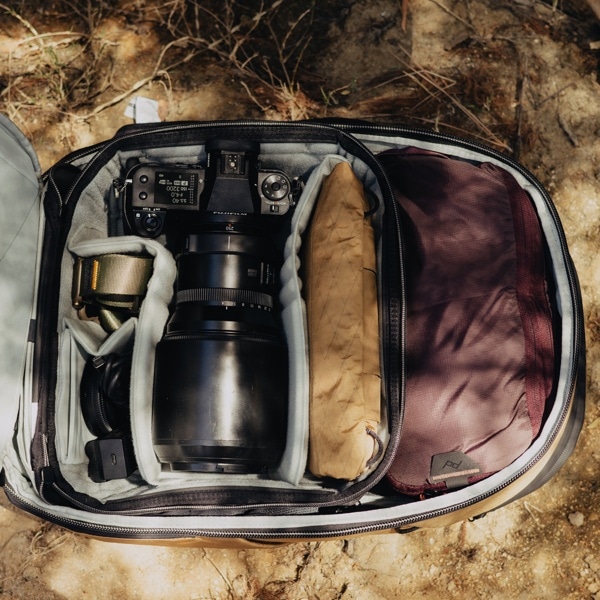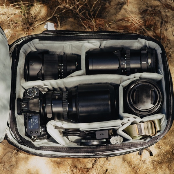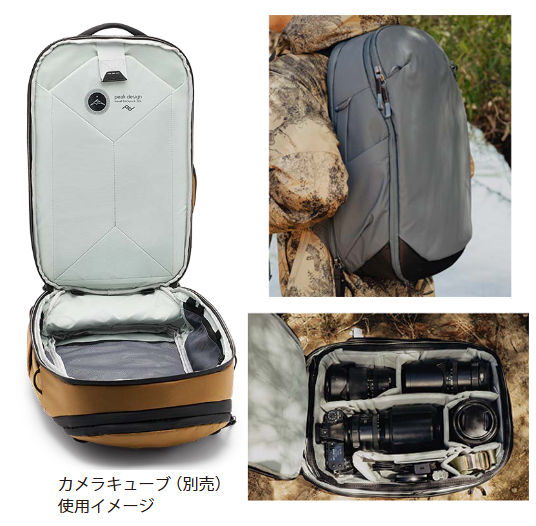 メインコンパートメントへはバックパネルを大きく開いてアクセスでき、パッキングツールと組み合わせることで荷物に合わせてさまざまなカスタマイズができます。