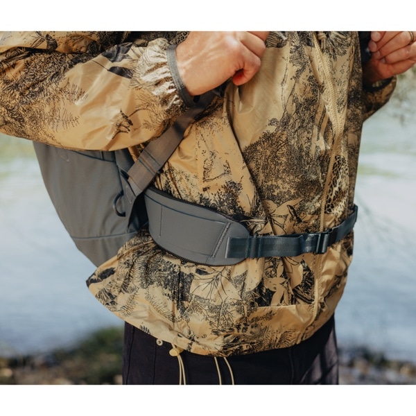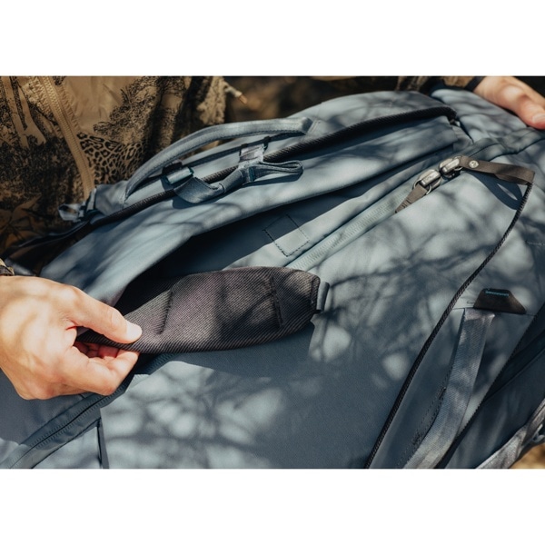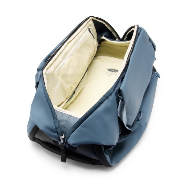 サイドのジッパーを開いて容量を 20L 増やすなど、用途に合わせて調節できる機能的なバッグです。