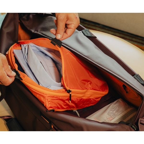 衣類などの収納に適したポーチです。内部仕切りによって清潔な服と汚れた服を分けることができ、内容量に応じてサイズを調節できます。ミディアムとスモールの 2 サイズ展開です。
