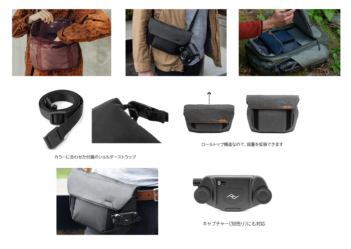 コンパクトカメラや小型のレンズを収納でき、ポーチ内側にはアクセサリー類を収納できるジップポケットとオーガナイザーポケットを備えています。