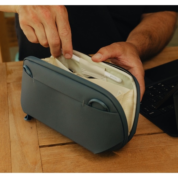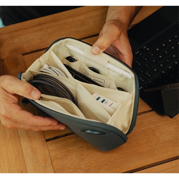 日本の折り紙に着想を得たポケットデザインで、ケーブルや SD カード、バッテリーに充電器など、さまざまな小物類を効率よく整理して収納できます。