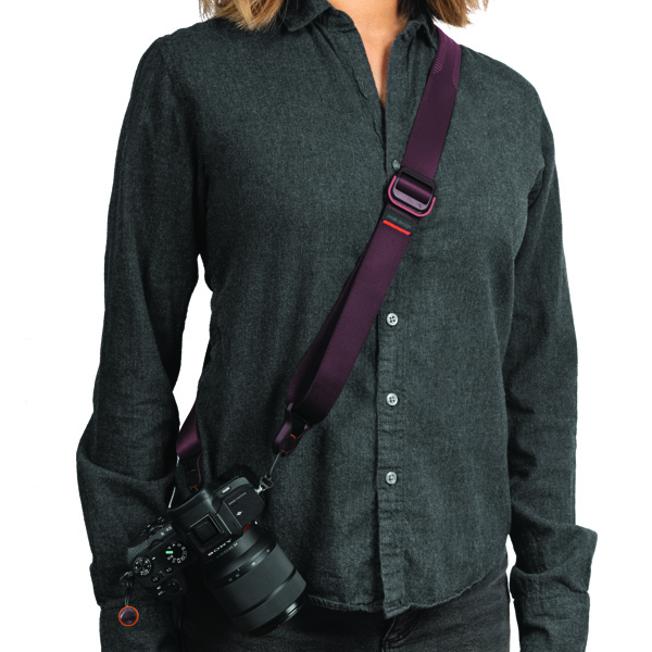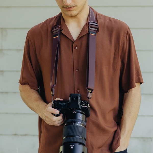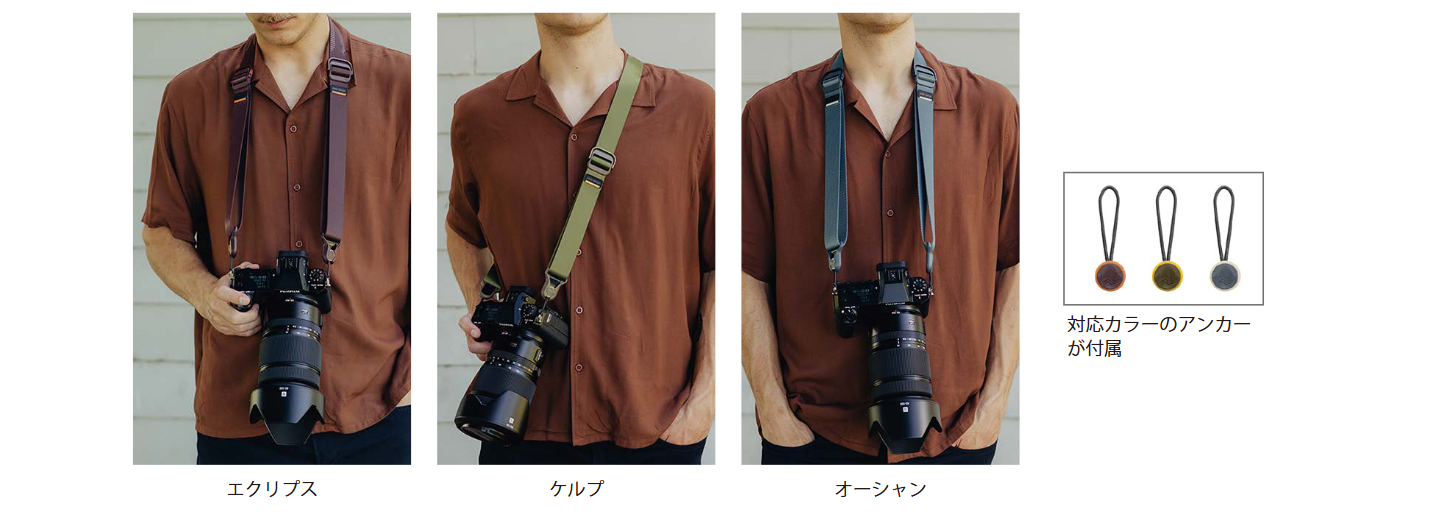 スライドよりもスリムなデザインで、ネック部分のパッドがないタイプのカメラストラップです。