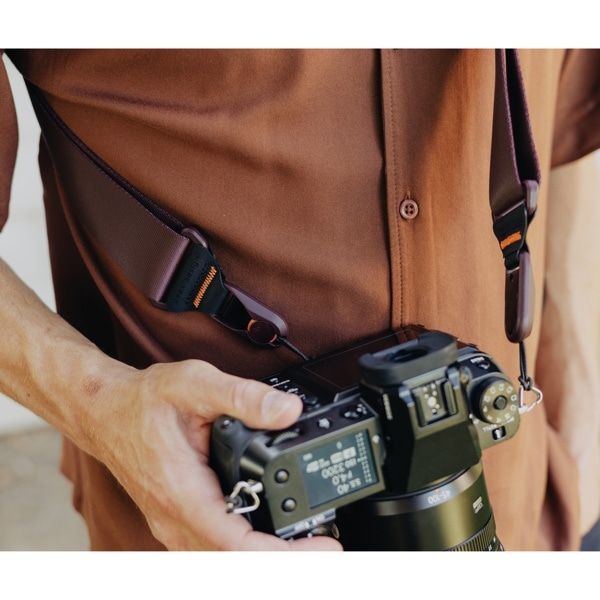 ネック部分はパッド入りで、長時間重いカメラを持ち運ぶ場合にも、負担がかかりにくい設計になっています。また、2 つのバックルはワンアクションで調節可能で、素早くストラップの長さを調整できます。