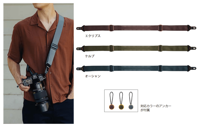 グリップ付一眼レフなど、多くのサイズのカメラに対応したストラップです。